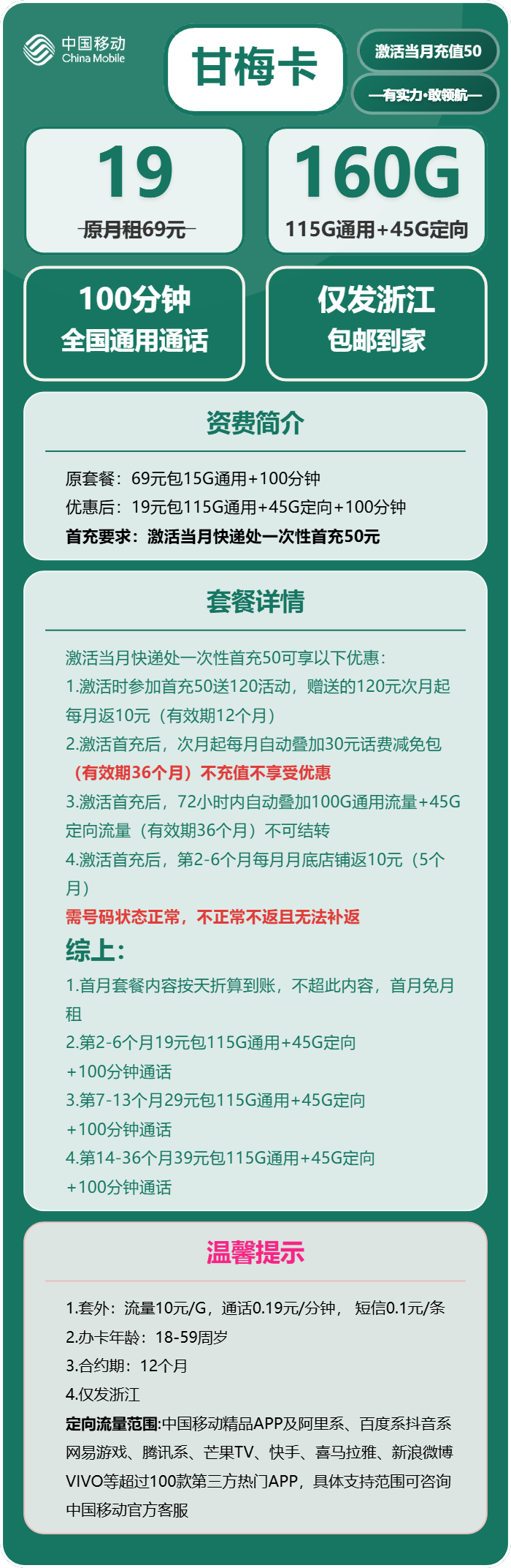 资费:甘梅卡19元包115G通用+45G定向+100分钟