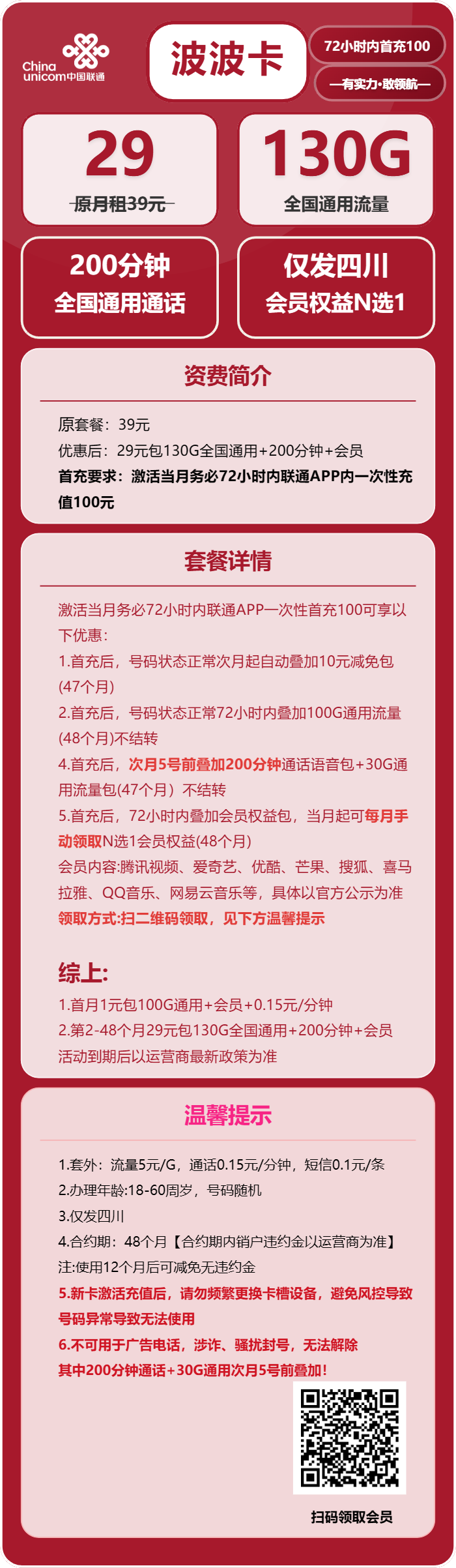 资费:波波卡29元包130G通用+200分钟+会员